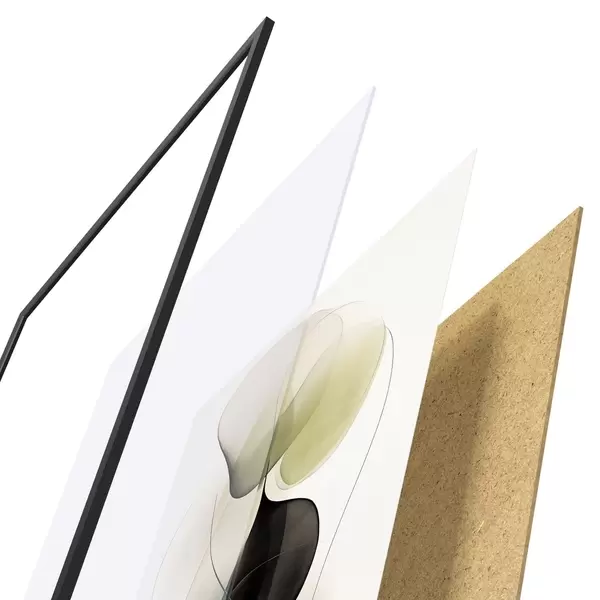 Das Poster besteht aus einem Rahmen, Plexiglas, einem gedruckten Bild und einer Rückwand aus Spanplatten. Dank der Halterungen auf der Rückseite kann das Poster sofort an die Wand gehängt werden.