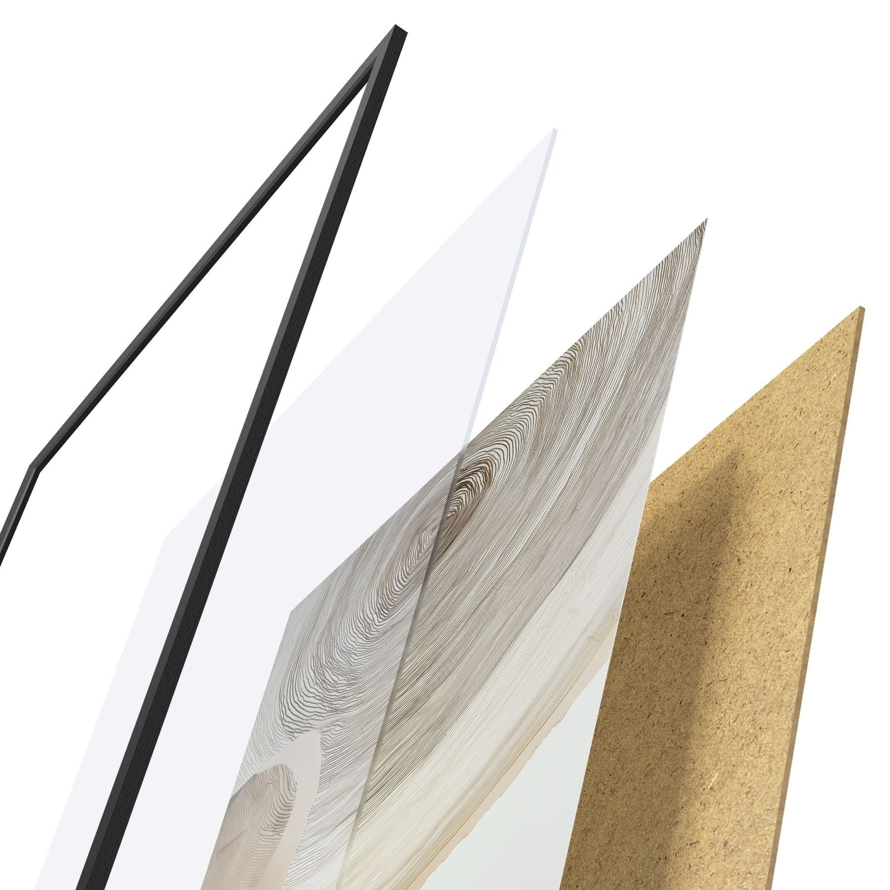 Das Poster besteht aus einem Rahmen, Plexiglas, einem gedruckten Bild und einer Rückwand aus Spanplatten. Dank der Halterungen auf der Rückseite kann das Poster sofort an die Wand gehängt werden.
