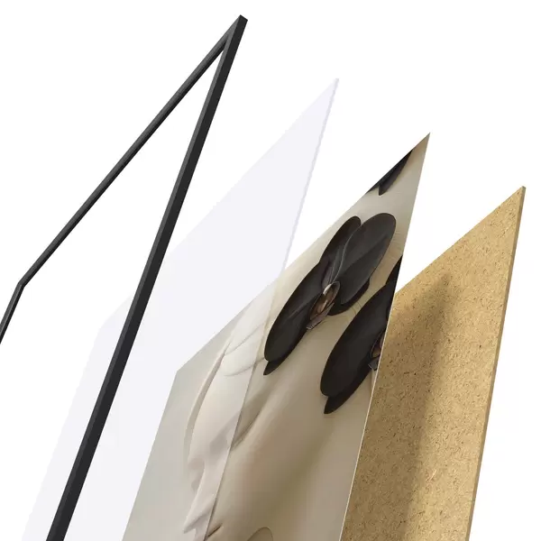 Das Poster besteht aus einem Rahmen, Plexiglas, einem gedruckten Bild und einer Rückwand aus Spanplatten. Dank der Halterungen auf der Rückseite kann das Poster sofort an die Wand gehängt werden.
