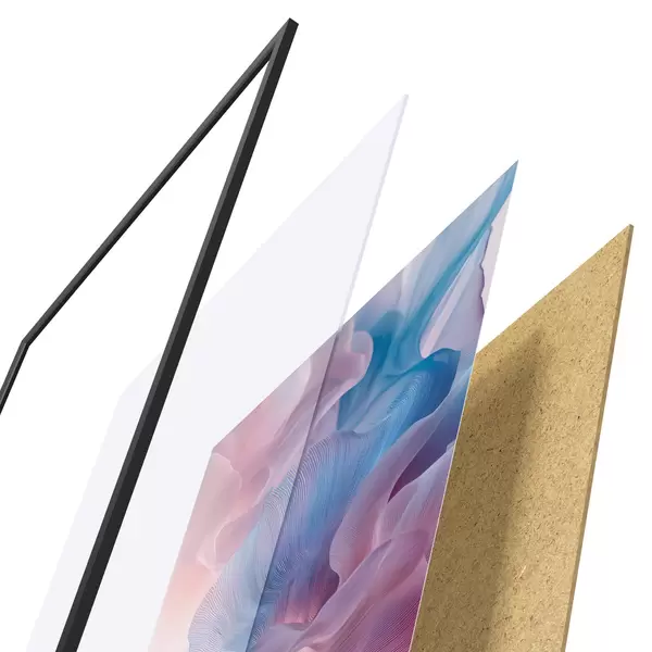 Das Poster besteht aus einem Rahmen, Plexiglas, einem gedruckten Bild und einer Rückwand aus Spanplatten. Dank der Halterungen auf der Rückseite kann das Poster sofort an die Wand gehängt werden.