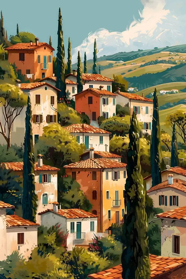 Poster Mediterranes Bergdorf, übereinanderliegende Häuser in warmen Farbtönen mit Terrakottadächern Nr f47950