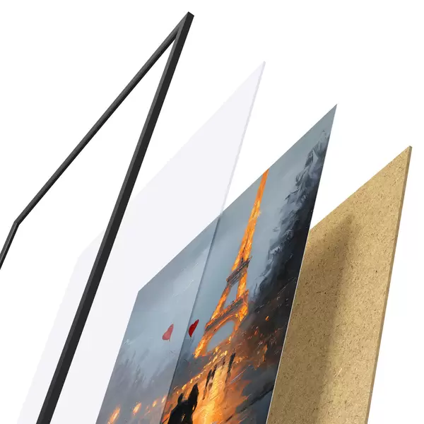 Das Poster besteht aus einem Rahmen, Plexiglas, einem gedruckten Bild und einer Rückwand aus Spanplatten. Dank der Halterungen auf der Rückseite kann das Poster sofort an die Wand gehängt werden.