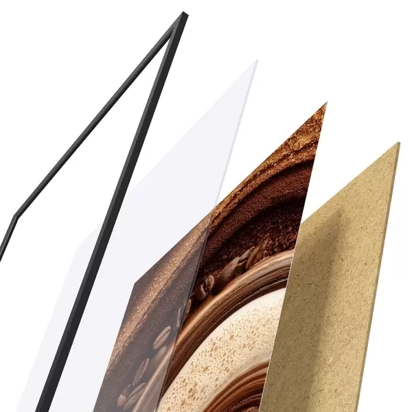 Das Poster besteht aus einem Rahmen, Plexiglas, einem gedruckten Bild und einer Rückwand aus Spanplatten. Dank der Halterungen auf der Rückseite kann das Poster sofort an die Wand gehängt werden.