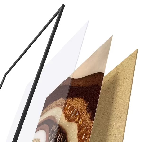 Das Poster besteht aus einem Rahmen, Plexiglas, einem gedruckten Bild und einer Rückwand aus Spanplatten. Dank der Halterungen auf der Rückseite kann das Poster sofort an die Wand gehängt werden.