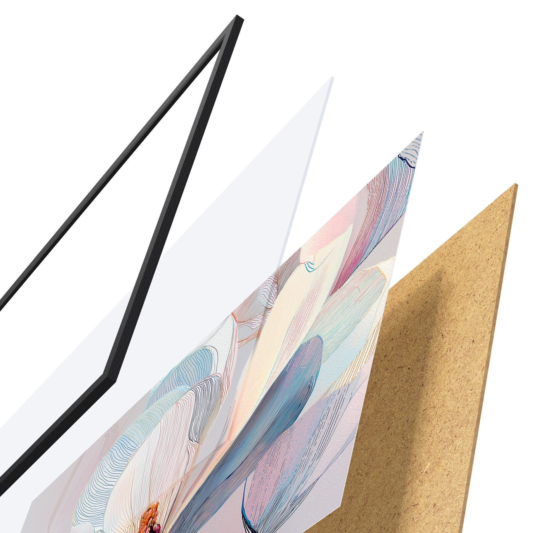 Das Poster besteht aus einem Rahmen, Plexiglas, einem gedruckten Bild und einer Rückwand aus Spanplatten. Dank der Halterungen auf der Rückseite kann das Poster sofort an die Wand gehängt werden.