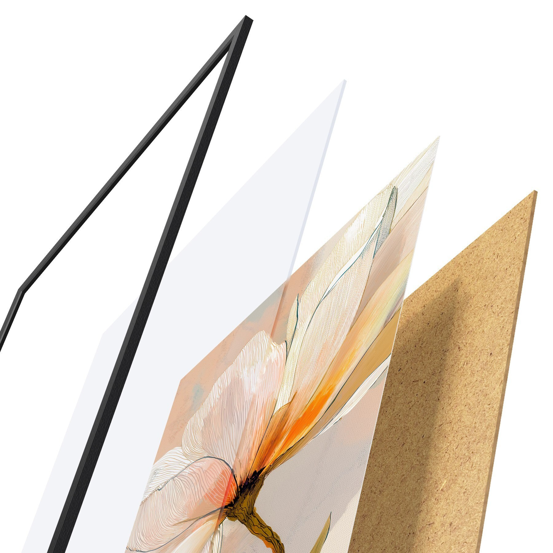 Das Poster besteht aus einem Rahmen, Plexiglas, einem gedruckten Bild und einer Rückwand aus Spanplatten. Dank der Halterungen auf der Rückseite kann das Poster sofort an die Wand gehängt werden.