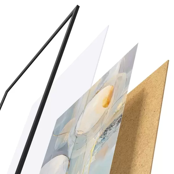 Das Poster besteht aus einem Rahmen, Plexiglas, einem gedruckten Bild und einer Rückwand aus Spanplatten. Dank der Halterungen auf der Rückseite kann das Poster sofort an die Wand gehängt werden.