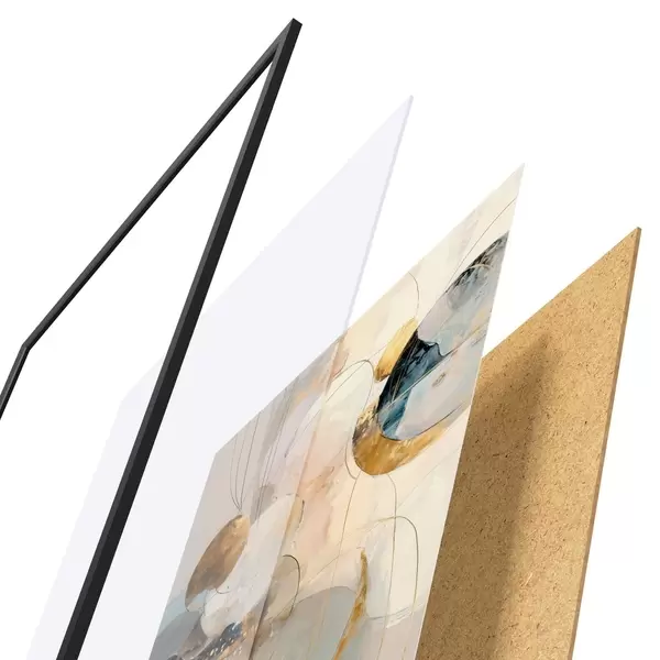 Das Poster besteht aus einem Rahmen, Plexiglas, einem gedruckten Bild und einer Rückwand aus Spanplatten. Dank der Halterungen auf der Rückseite kann das Poster sofort an die Wand gehängt werden.