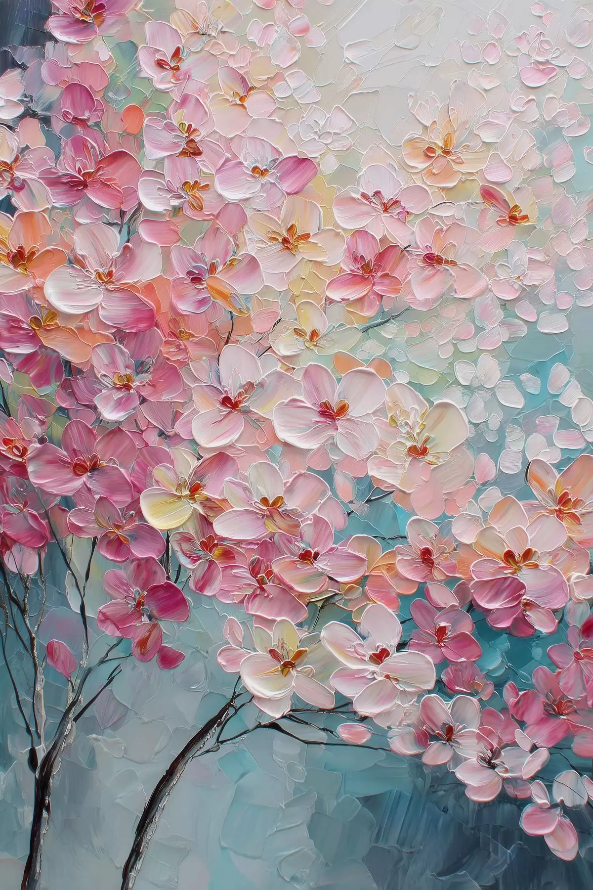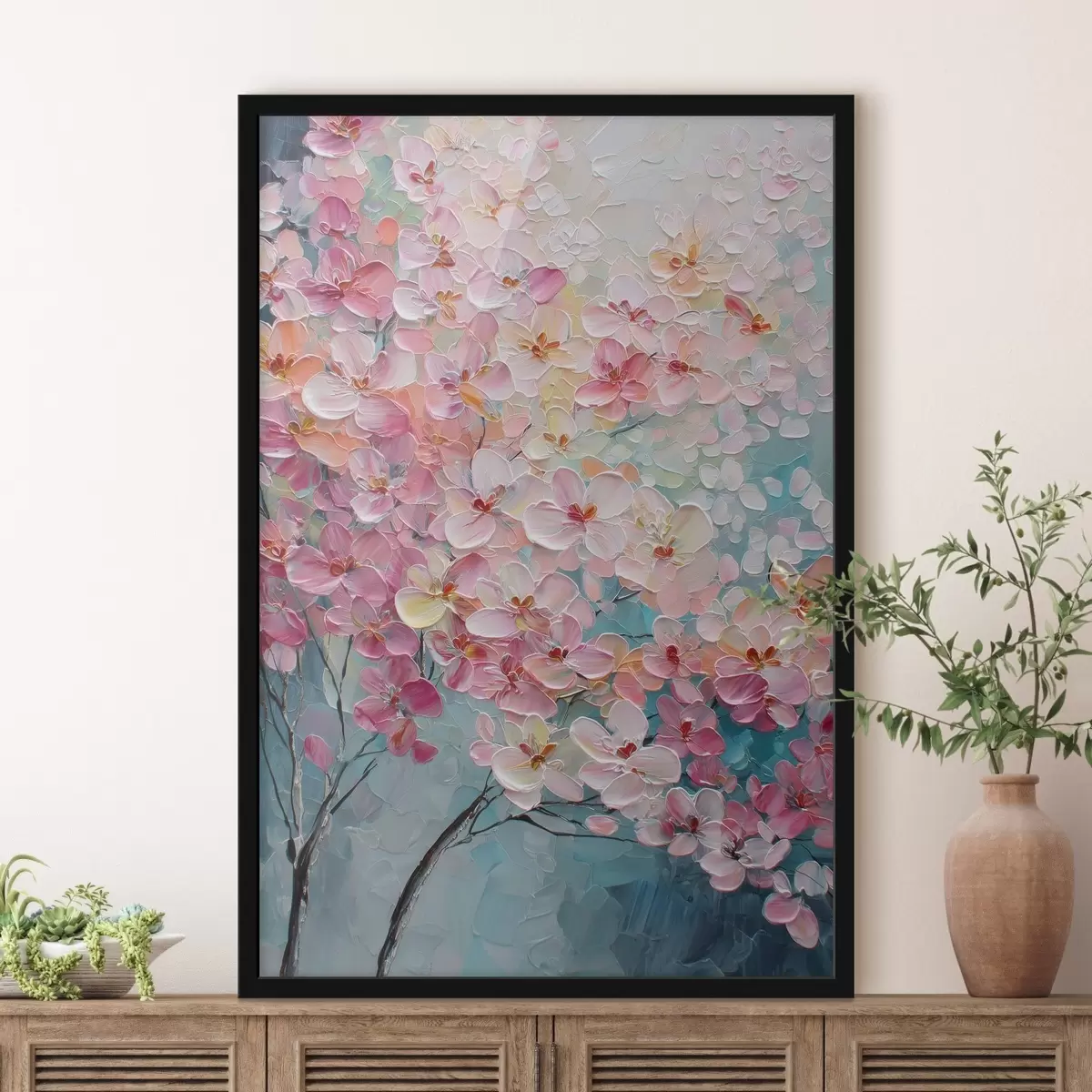Poster Zweig mit rosa Blüten auf blauem Hintergrund im Stil eines Ölgemäldes f47987