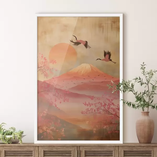 Poster Kräne vor der Sonne und den Bergen: Illustration im digitalen Kunststil Nr f47992