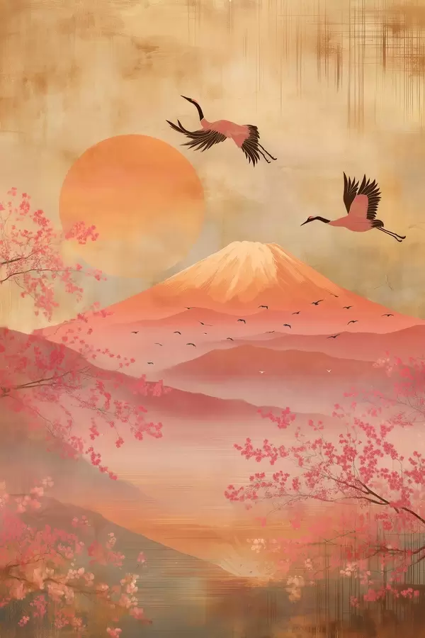 Poster Kräne vor der Sonne und den Bergen: Illustration im digitalen Kunststil Nr f47992