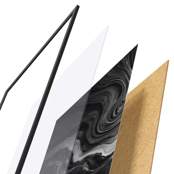 Das Poster besteht aus einem Rahmen, Plexiglas, einem gedruckten Bild und einer Rückwand aus Spanplatten. Dank der Halterungen auf der Rückseite kann das Poster sofort an die Wand gehängt werden.