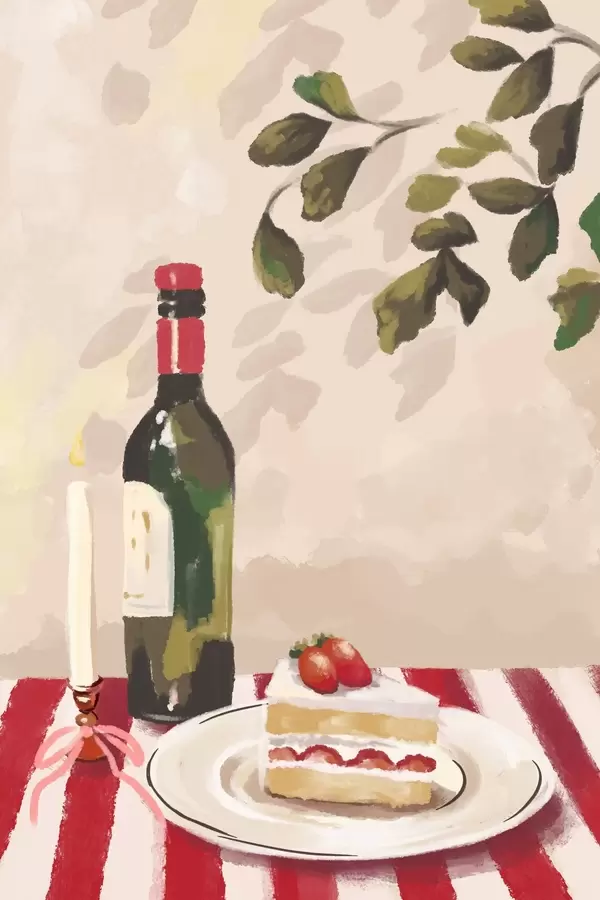 Poster Stillleben mit Wein, Kerze und Kuchen f48024