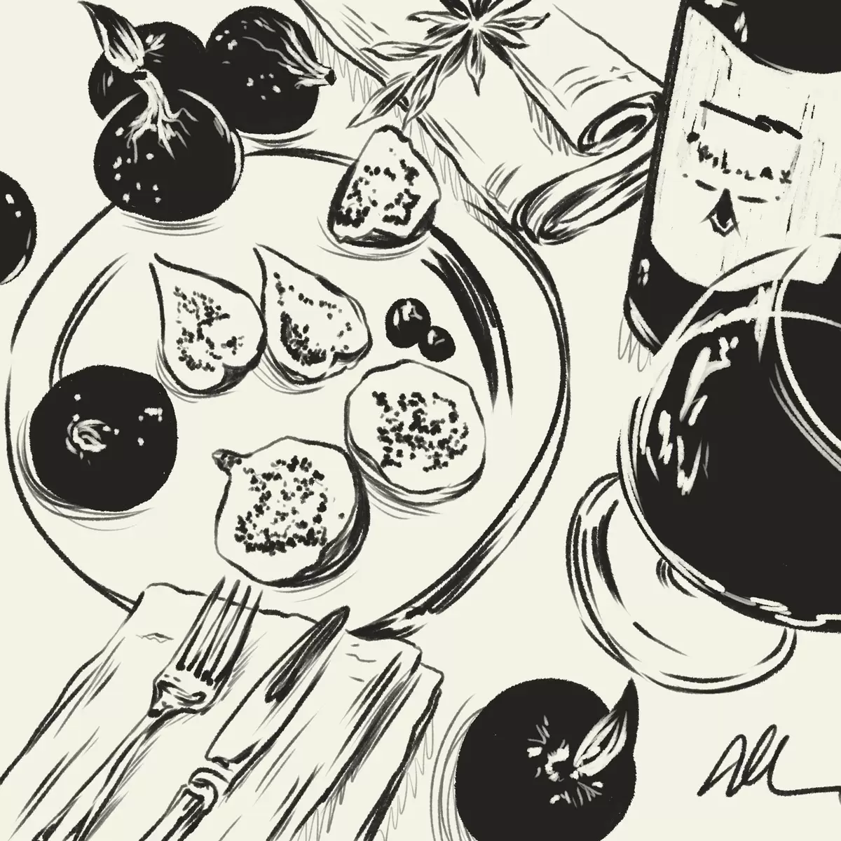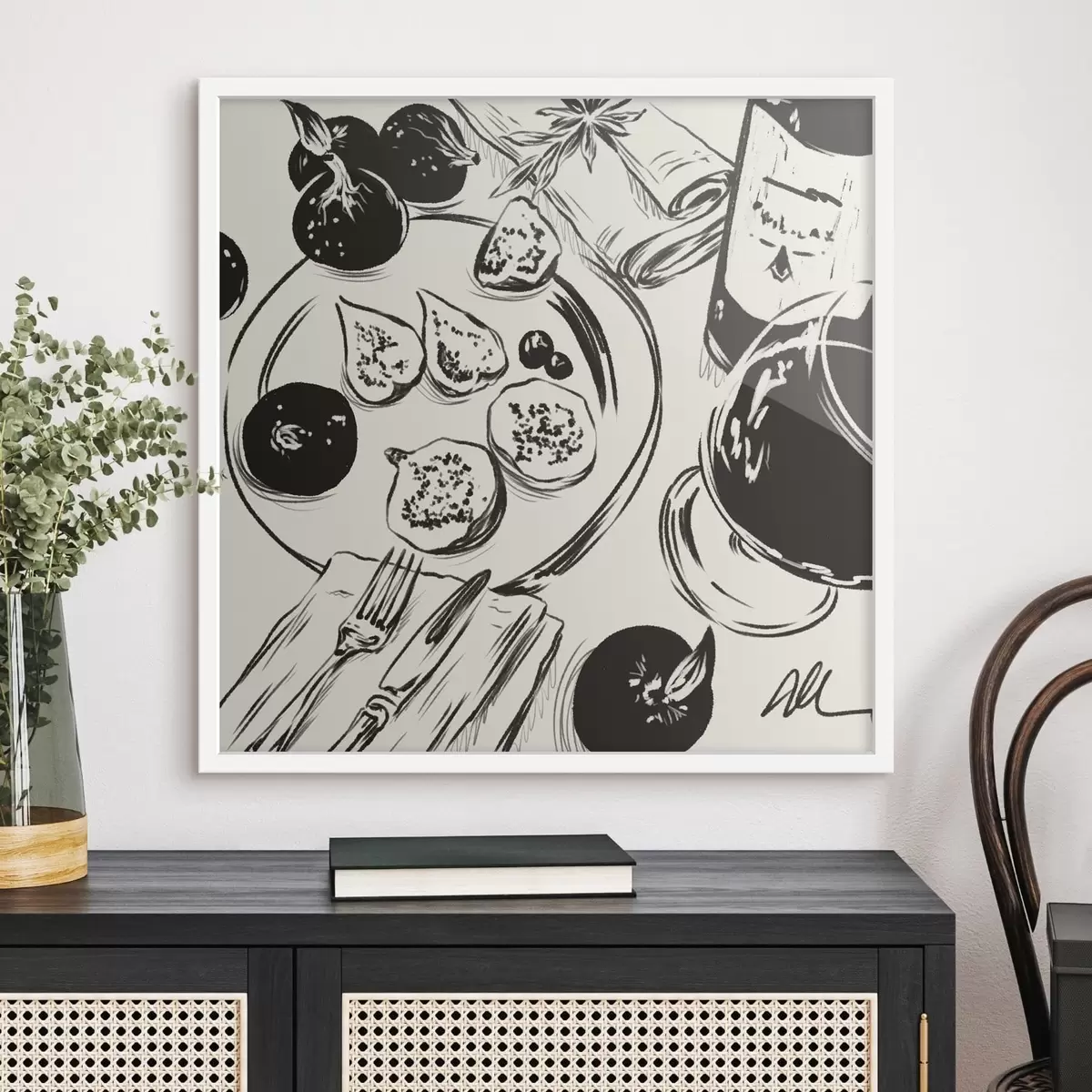 Poster Schwarz-Weiß-Skizze eines Tisches mit Obst und einem Glas Nr f48030