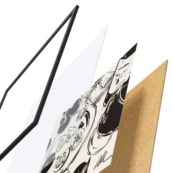 Das Poster besteht aus einem Rahmen, Plexiglas, einem gedruckten Bild und einer Rückwand aus Spanplatten. Dank der Halterungen auf der Rückseite kann das Poster sofort an die Wand gehängt werden.