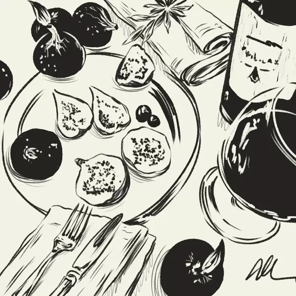 Poster Schwarz-Weiß-Skizze eines Tisches mit Obst und einem Glas f48030