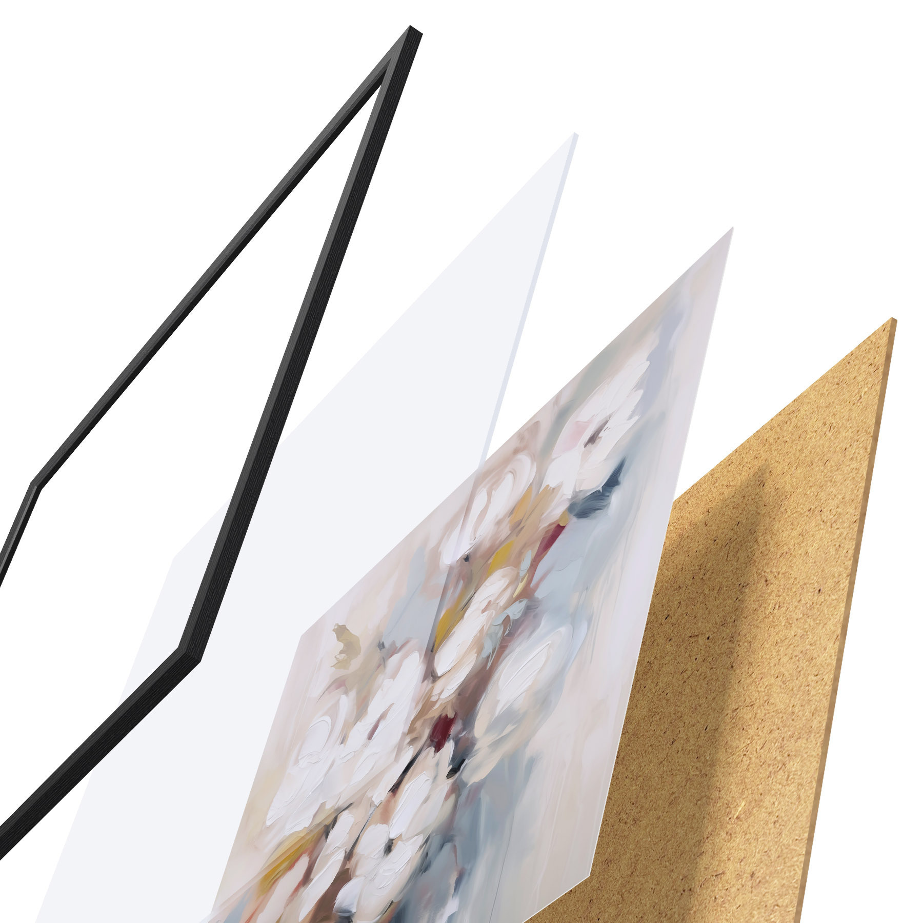 Das Poster besteht aus einem Rahmen, Plexiglas, einem gedruckten Bild und einer Rückwand aus Spanplatten. Dank der Halterungen auf der Rückseite kann das Poster sofort an die Wand gehängt werden.