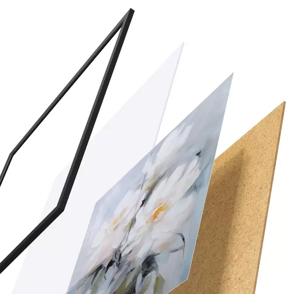 Das Poster besteht aus einem Rahmen, Plexiglas, einem gedruckten Bild und einer Rückwand aus Spanplatten. Dank der Halterungen auf der Rückseite kann das Poster sofort an die Wand gehängt werden.