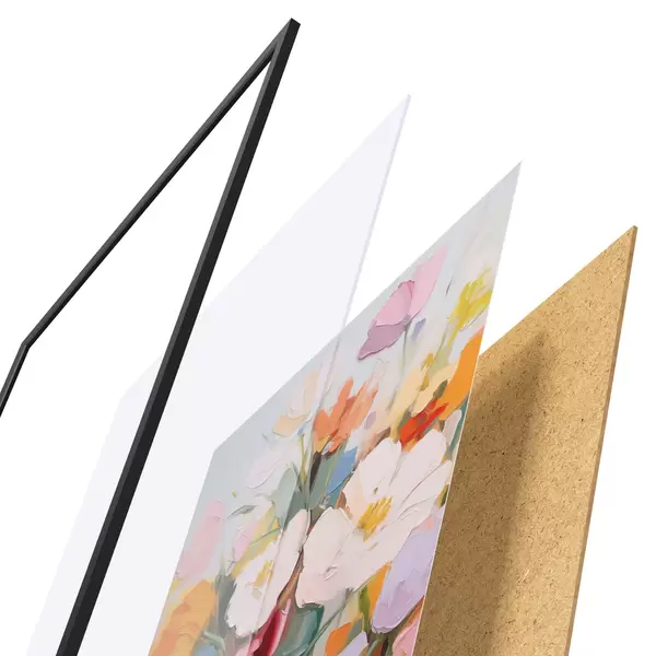 Das Poster besteht aus einem Rahmen, Plexiglas, einem gedruckten Bild und einer Rückwand aus Spanplatten. Dank der Halterungen auf der Rückseite kann das Poster sofort an die Wand gehängt werden.