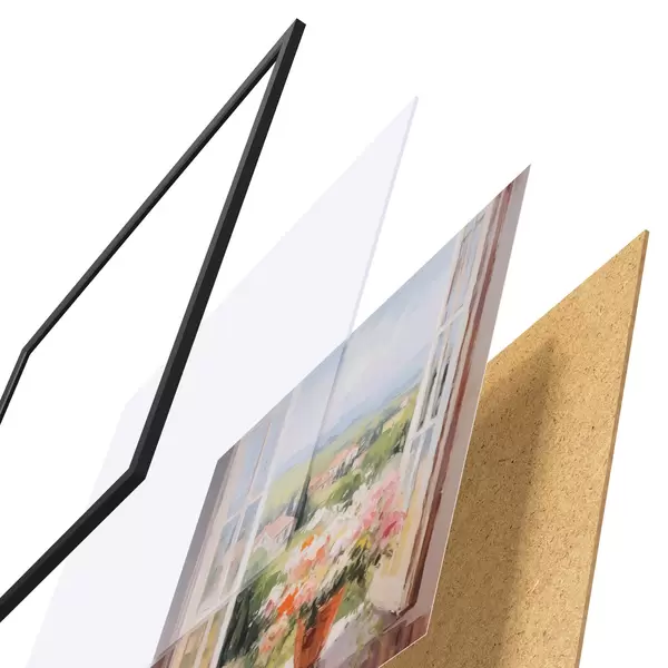Das Poster besteht aus einem Rahmen, Plexiglas, einem gedruckten Bild und einer Rückwand aus Spanplatten. Dank der Halterungen auf der Rückseite kann das Poster sofort an die Wand gehängt werden.