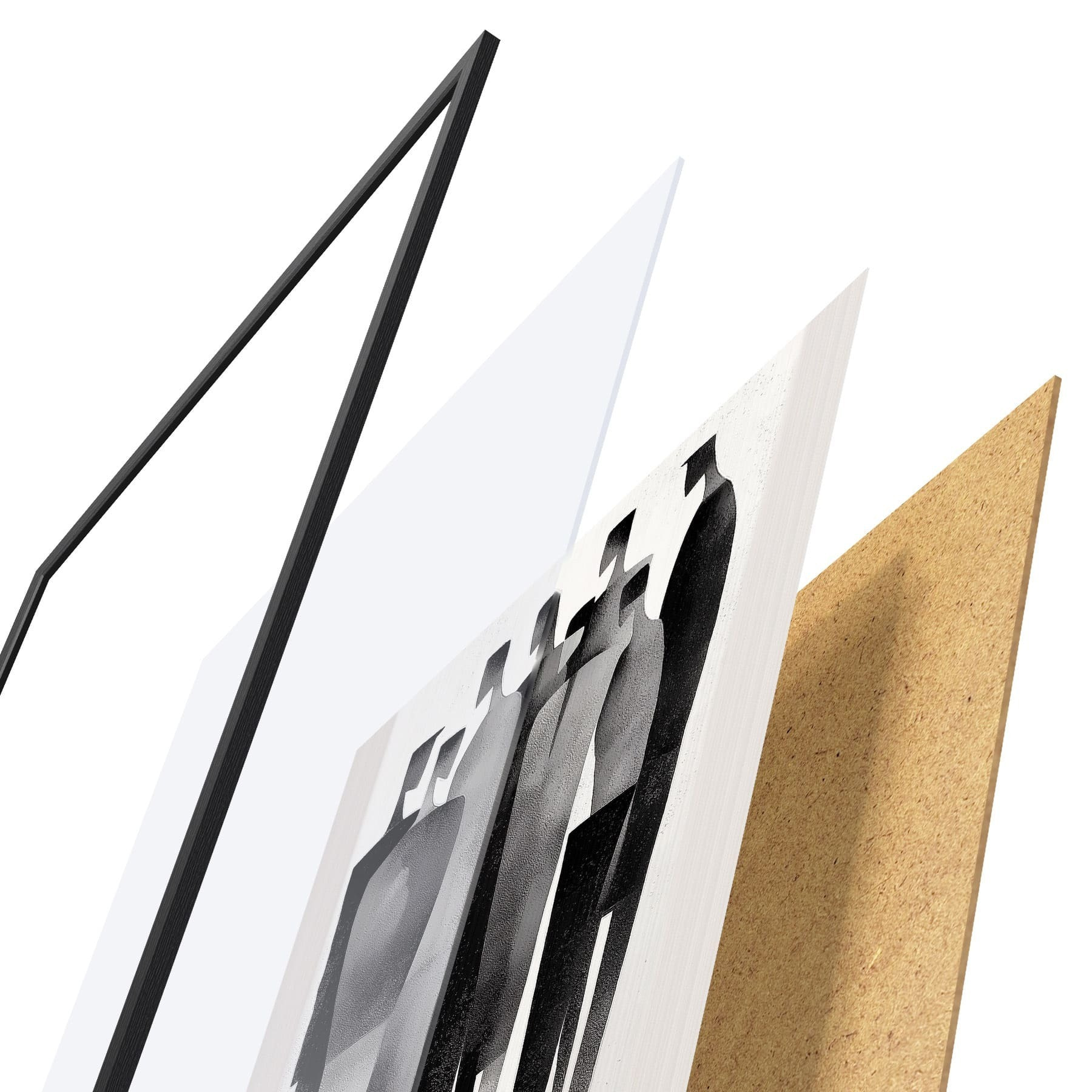 Das Poster besteht aus einem Rahmen, Plexiglas, einem gedruckten Bild und einer Rückwand aus Spanplatten. Dank der Halterungen auf der Rückseite kann das Poster sofort an die Wand gehängt werden.