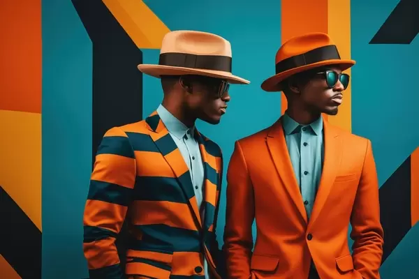 Poster Zwei Männer in bunten Anzügen und Hüten f48091