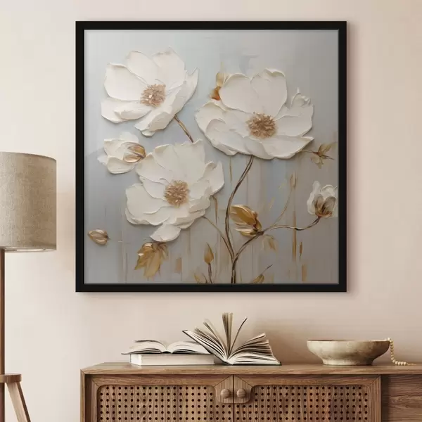 Poster Reliefartige weiße Blüten mit warmen Blättern f48093