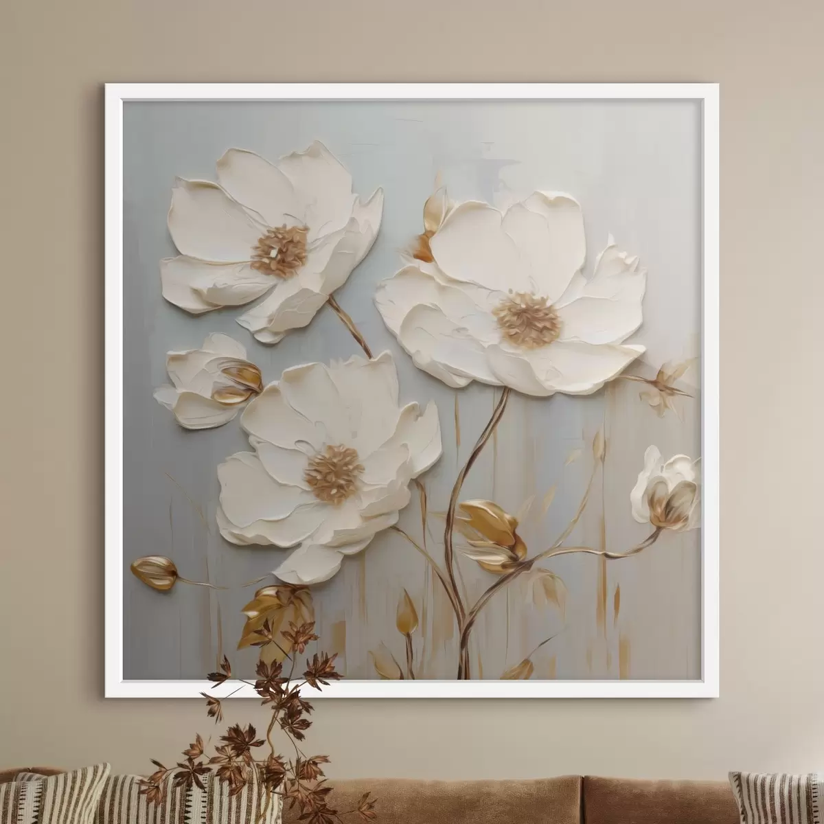 Poster Reliefartige weiße Blüten mit warmen Blättern Nr f48093