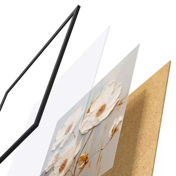 Das Poster besteht aus einem Rahmen, Plexiglas, einem gedruckten Bild und einer Rückwand aus Spanplatten. Dank der Halterungen auf der Rückseite kann das Poster sofort an die Wand gehängt werden.