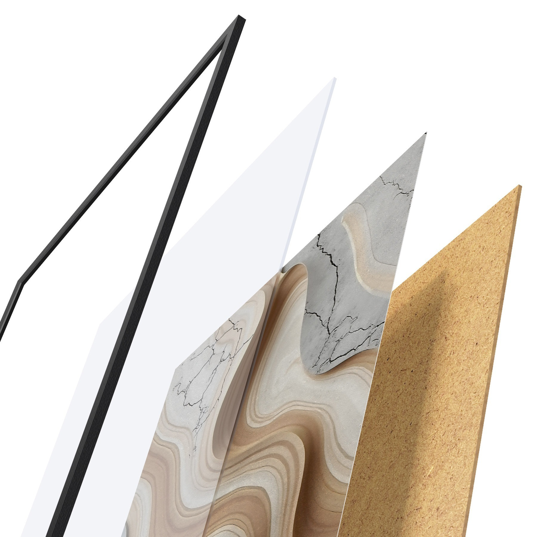Das Poster besteht aus einem Rahmen, Plexiglas, einem gedruckten Bild und einer Rückwand aus Spanplatten. Dank der Halterungen auf der Rückseite kann das Poster sofort an die Wand gehängt werden.