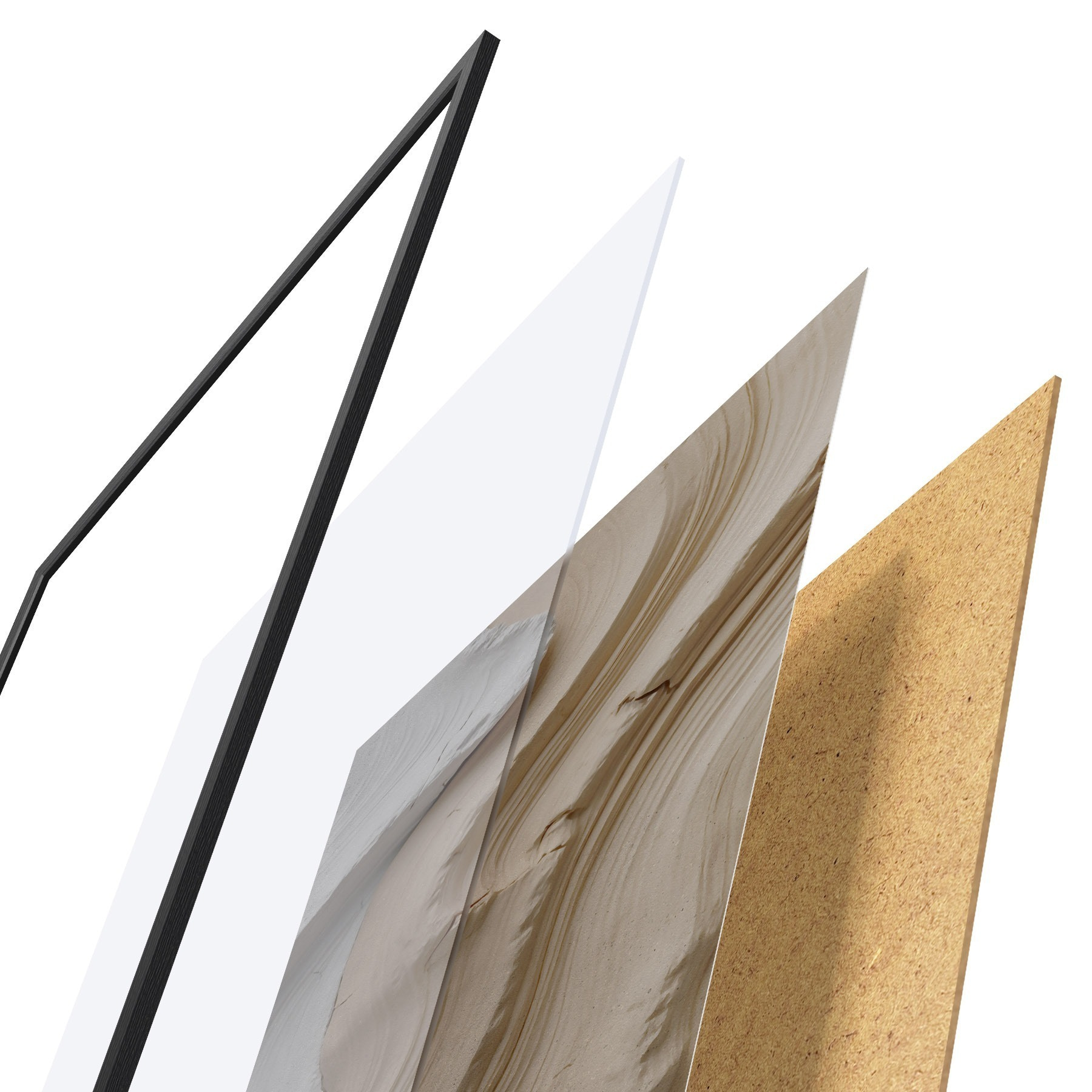 Das Poster besteht aus einem Rahmen, Plexiglas, einem gedruckten Bild und einer Rückwand aus Spanplatten. Dank der Halterungen auf der Rückseite kann das Poster sofort an die Wand gehängt werden.