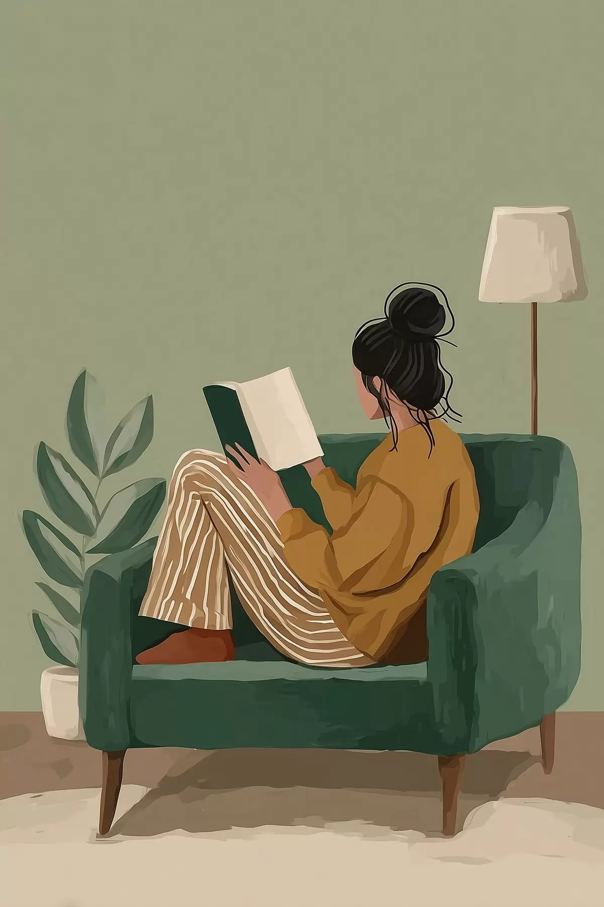 Poster Minimalistische, gemütliche Illustration einer Frau, die in einem Sessel sitzt und liest Nr f48118