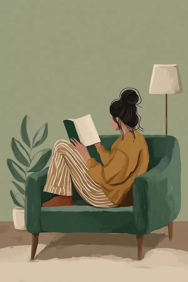 Poster Minimalistische, gemütliche Illustration einer Frau, die in einem Sessel sitzt und liest f48118