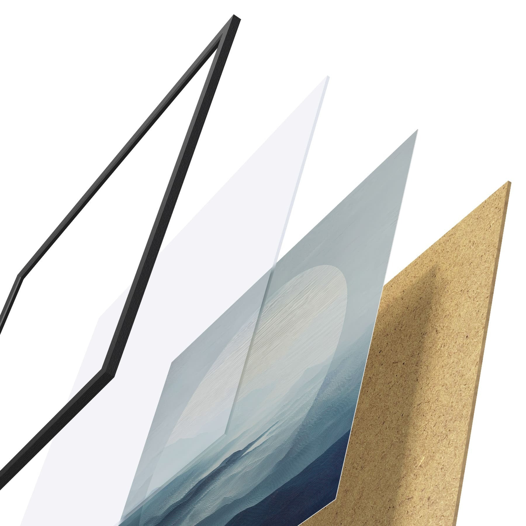 Das Poster besteht aus einem Rahmen, Plexiglas, einem gedruckten Bild und einer Rückwand aus Spanplatten. Dank der Halterungen auf der Rückseite kann das Poster sofort an die Wand gehängt werden.