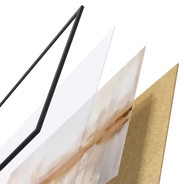 Das Poster besteht aus einem Rahmen, Plexiglas, einem gedruckten Bild und einer Rückwand aus Spanplatten. Dank der Halterungen auf der Rückseite kann das Poster sofort an die Wand gehängt werden.