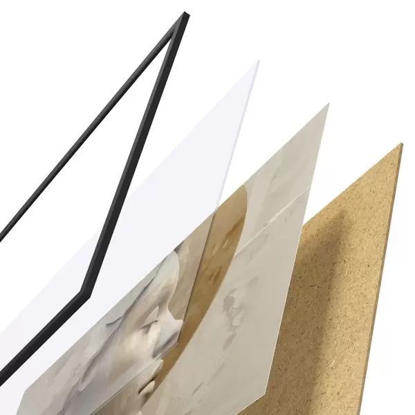 Das Poster besteht aus einem Rahmen, Plexiglas, einem gedruckten Bild und einer Rückwand aus Spanplatten. Dank der Halterungen auf der Rückseite kann das Poster sofort an die Wand gehängt werden.