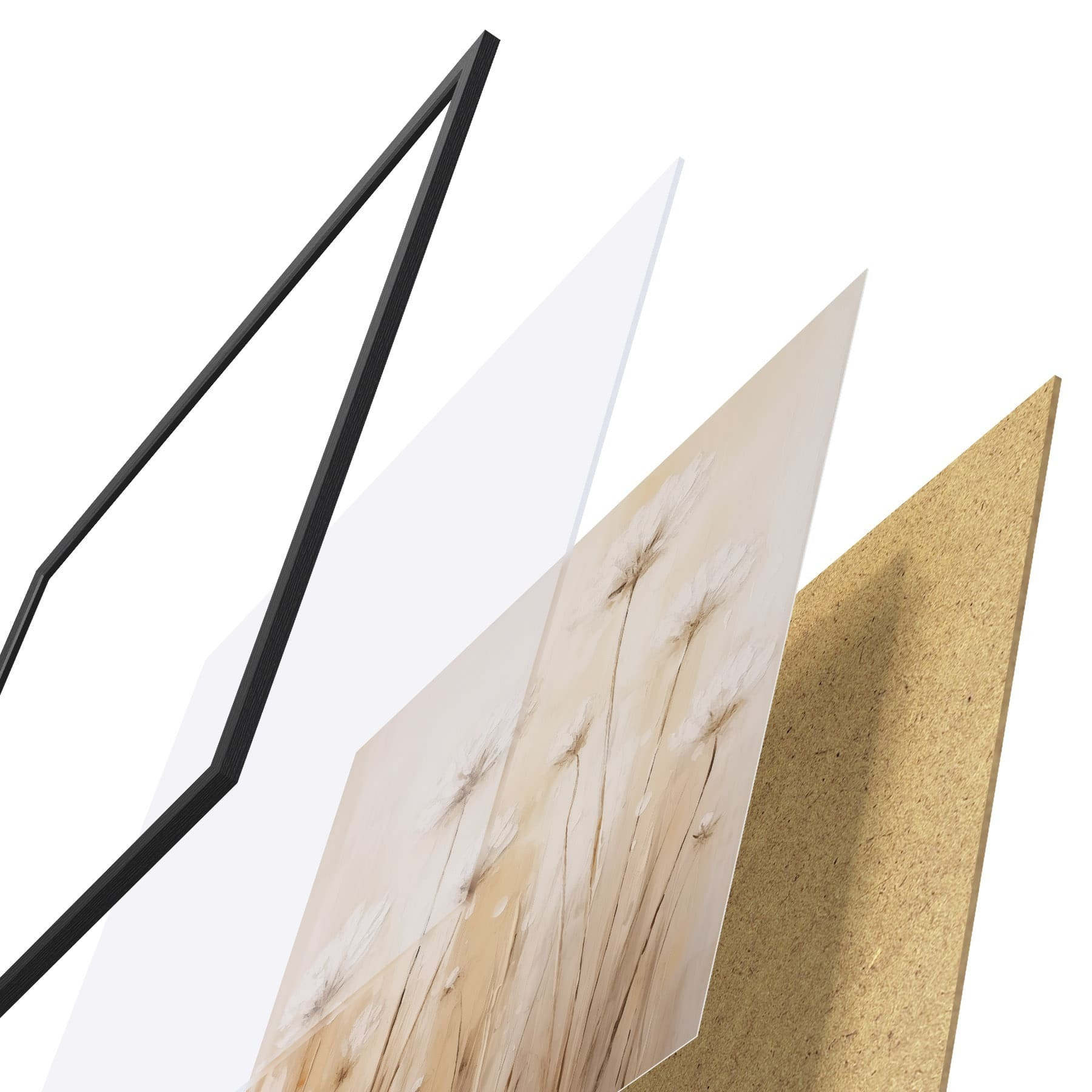 Das Poster besteht aus einem Rahmen, Plexiglas, einem gedruckten Bild und einer Rückwand aus Spanplatten. Dank der Halterungen auf der Rückseite kann das Poster sofort an die Wand gehängt werden.