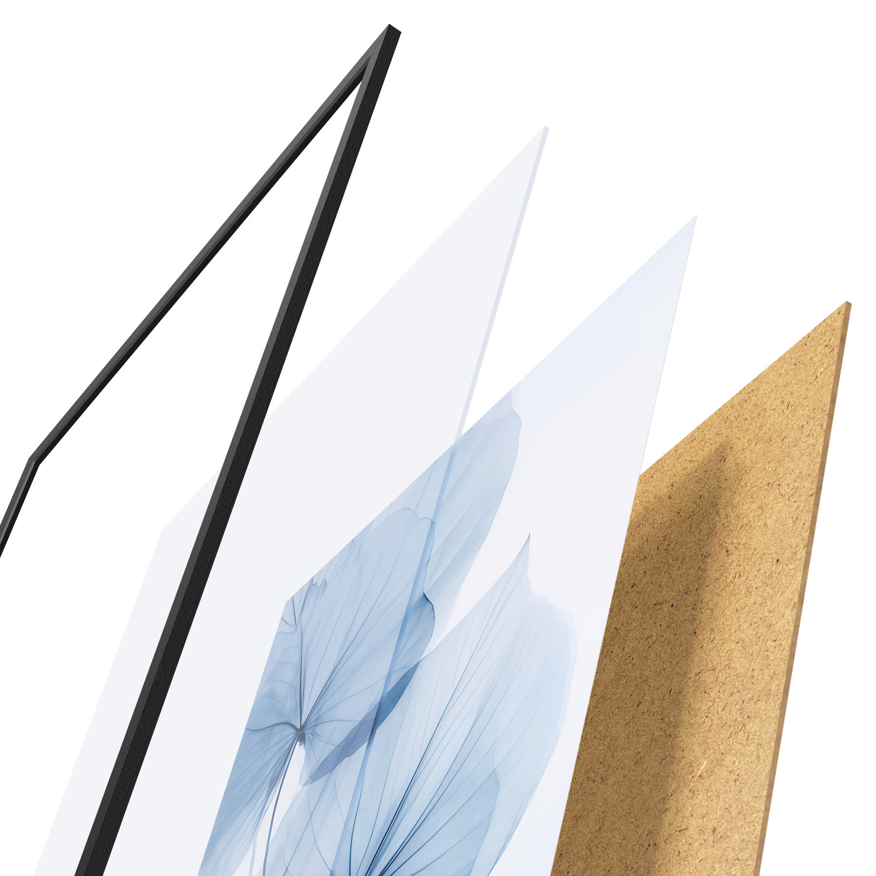 Das Poster besteht aus einem Rahmen, Plexiglas, einem gedruckten Bild und einer Rückwand aus Spanplatten. Dank der Halterungen auf der Rückseite kann das Poster sofort an die Wand gehängt werden.
