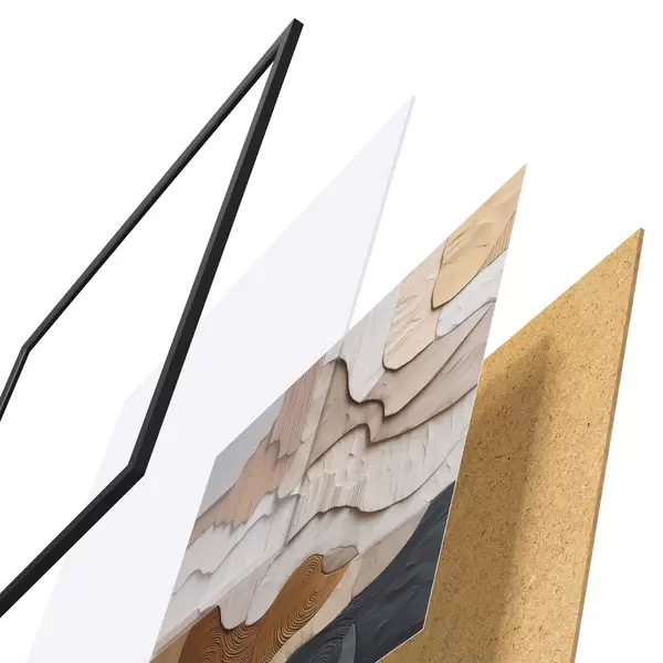 Das Poster besteht aus einem Rahmen, Plexiglas, einem gedruckten Bild und einer Rückwand aus Spanplatten. Dank der Halterungen auf der Rückseite kann das Poster sofort an die Wand gehängt werden.