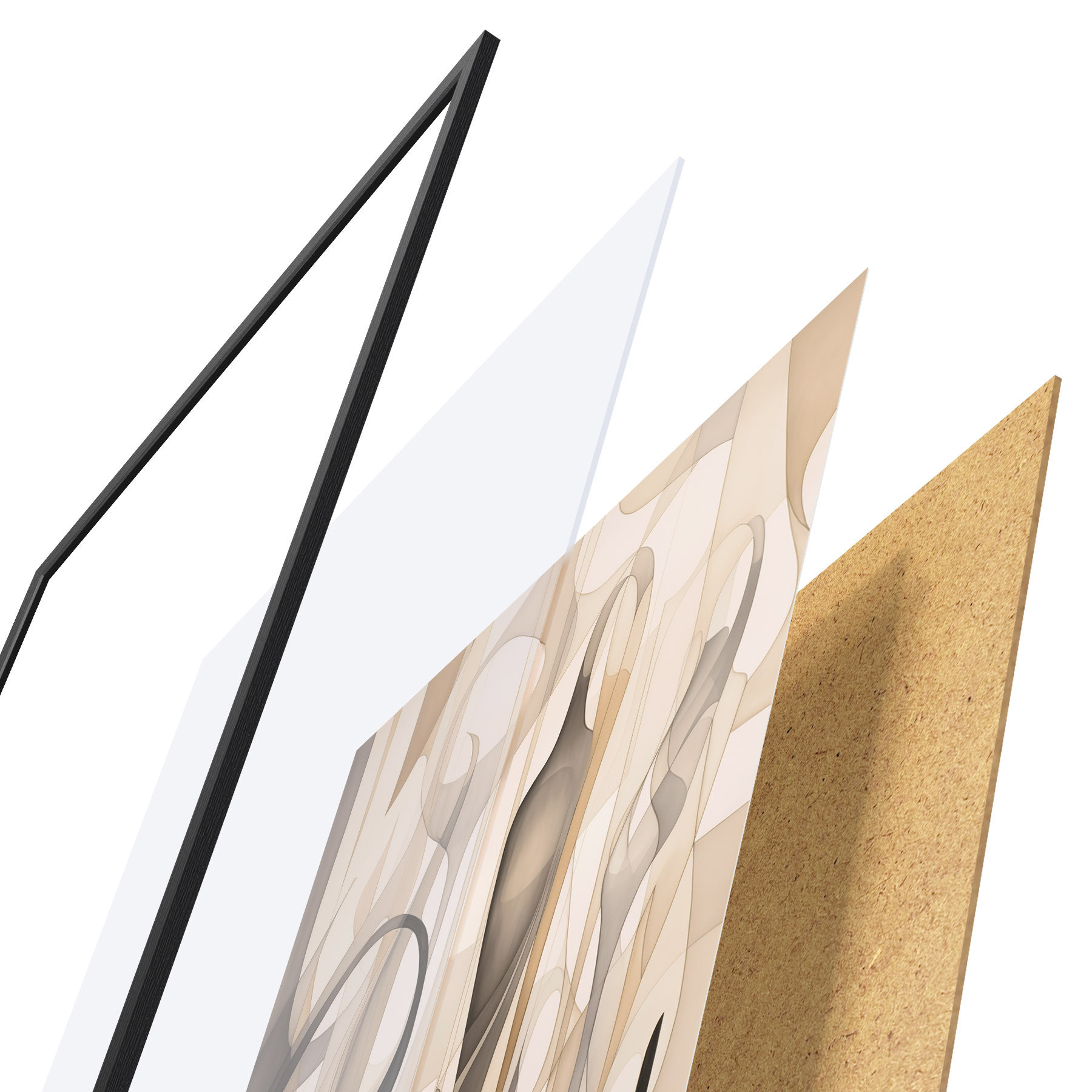 Das Poster besteht aus einem Rahmen, Plexiglas, einem gedruckten Bild und einer Rückwand aus Spanplatten. Dank der Halterungen auf der Rückseite kann das Poster sofort an die Wand gehängt werden.