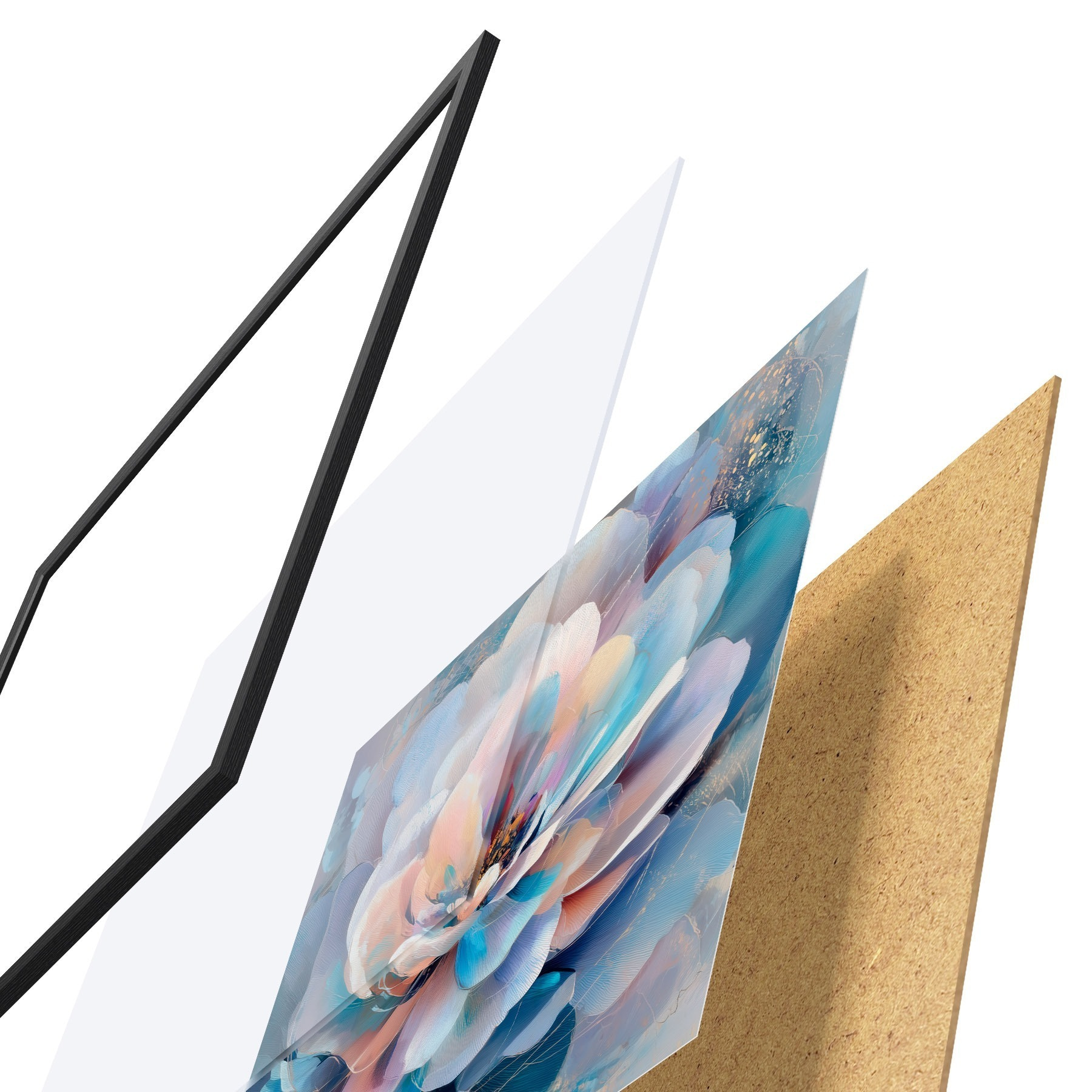 Das Poster besteht aus einem Rahmen, Plexiglas, einem gedruckten Bild und einer Rückwand aus Spanplatten. Dank der Halterungen auf der Rückseite kann das Poster sofort an die Wand gehängt werden.