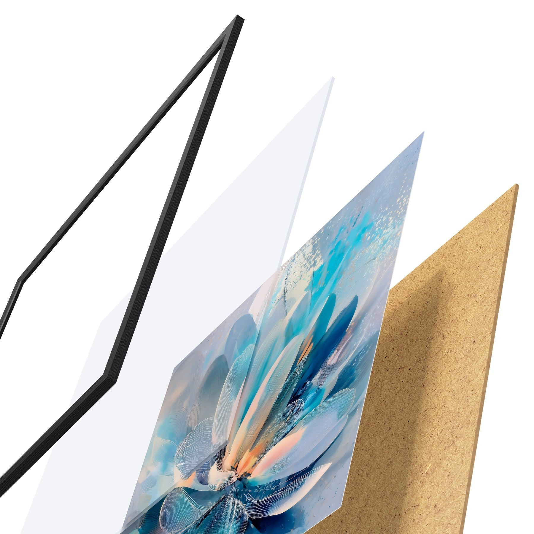Das Poster besteht aus einem Rahmen, Plexiglas, einem gedruckten Bild und einer Rückwand aus Spanplatten. Dank der Halterungen auf der Rückseite kann das Poster sofort an die Wand gehängt werden.