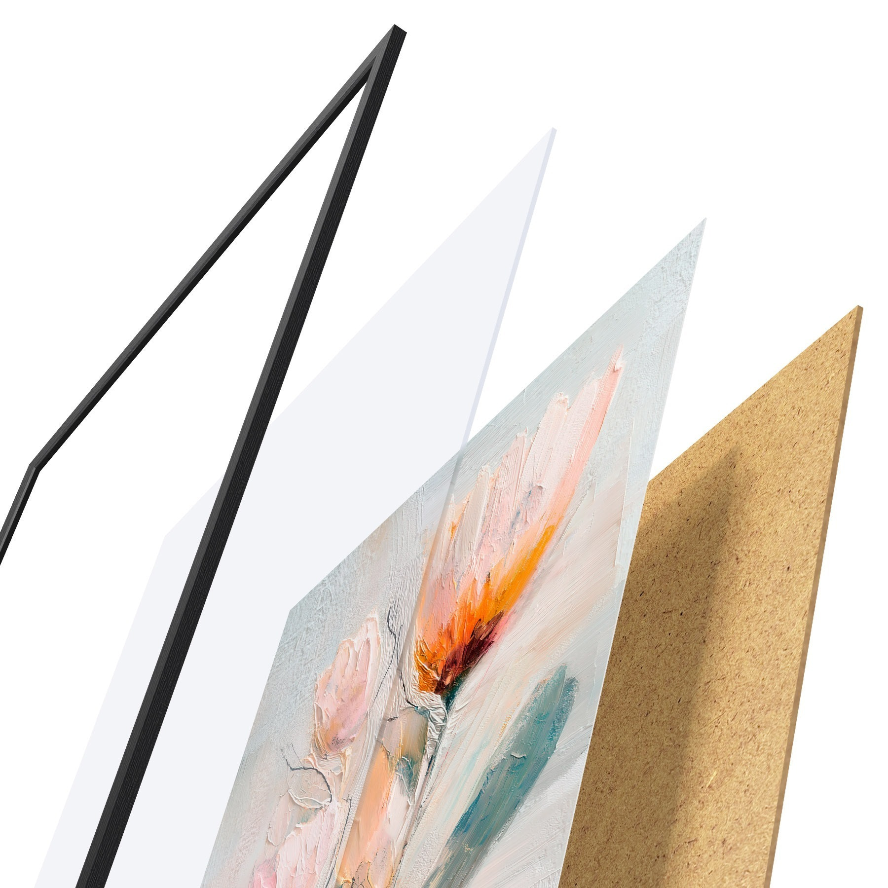 Das Poster besteht aus einem Rahmen, Plexiglas, einem gedruckten Bild und einer Rückwand aus Spanplatten. Dank der Halterungen auf der Rückseite kann das Poster sofort an die Wand gehängt werden.