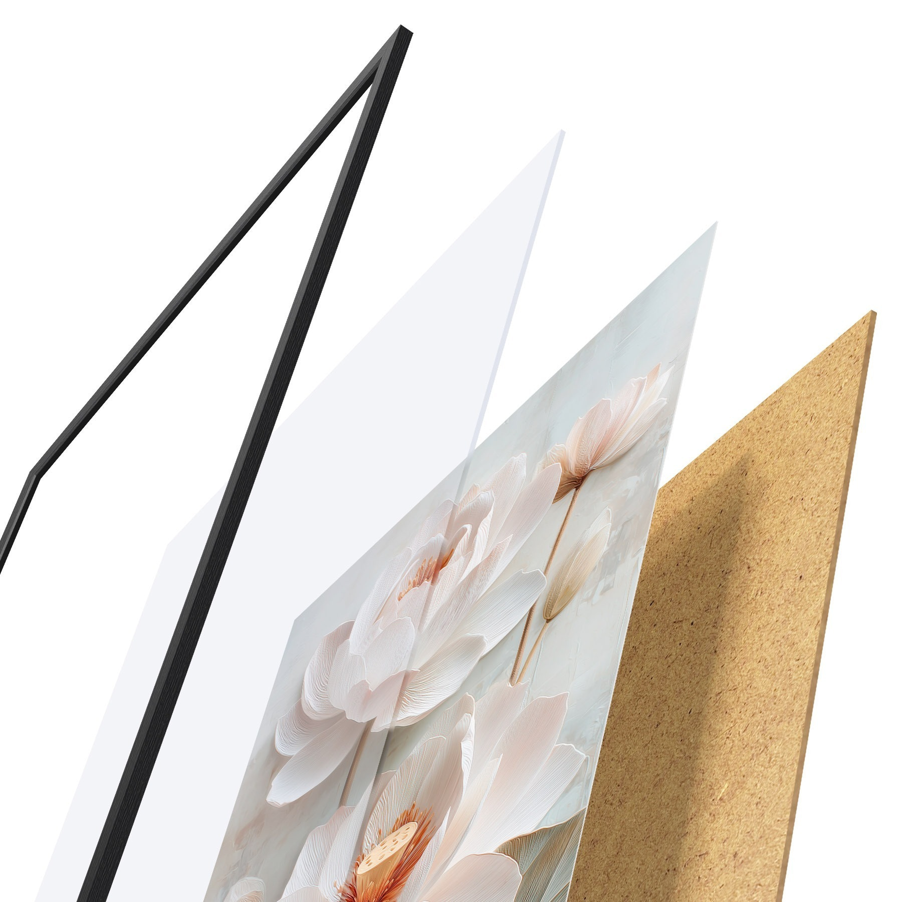 Das Poster besteht aus einem Rahmen, Plexiglas, einem gedruckten Bild und einer Rückwand aus Spanplatten. Dank der Halterungen auf der Rückseite kann das Poster sofort an die Wand gehängt werden.