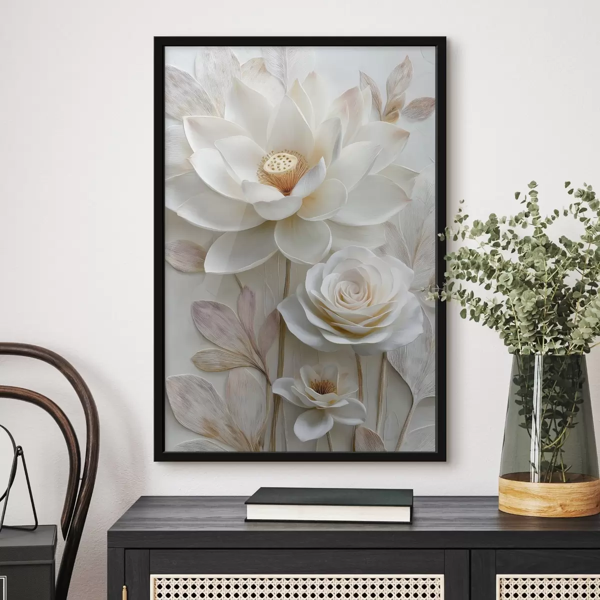 Poster Lotus- und Rosenblüten in zarten Cremetönen im Ölgemälde-Stil Nr f48214
