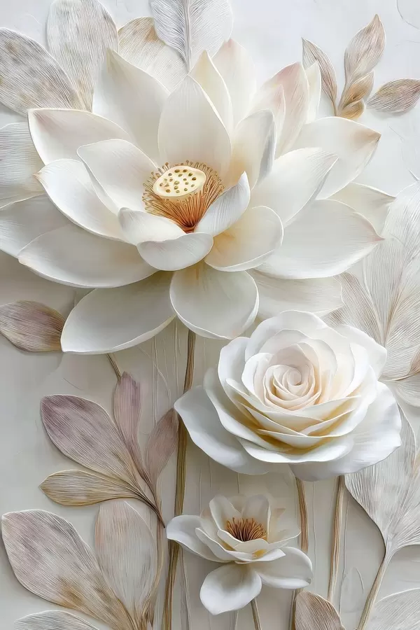 Poster Lotus- und Rosenblüten in zarten Cremetönen im Ölgemälde-Stil Nr f48214