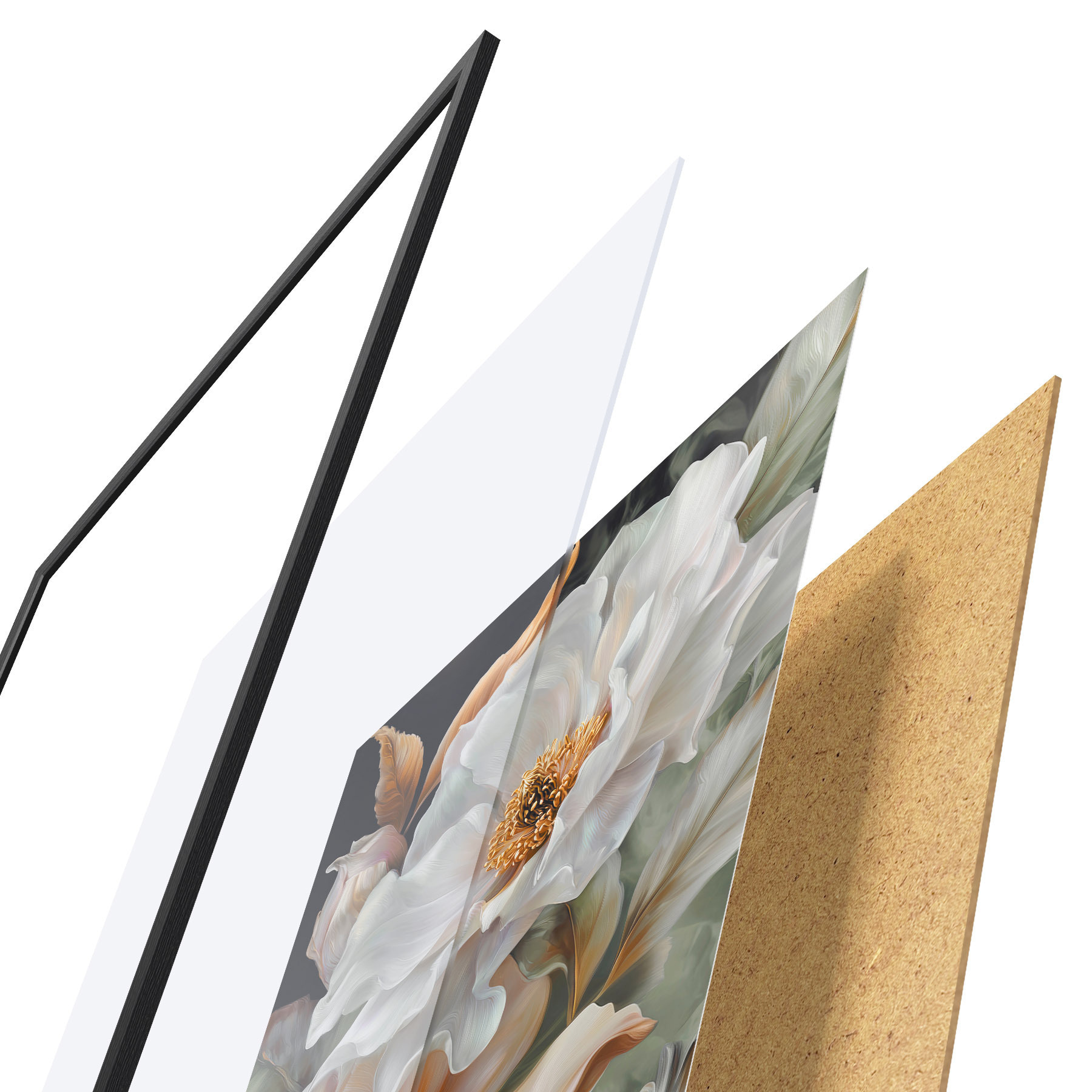 Das Poster besteht aus einem Rahmen, Plexiglas, einem gedruckten Bild und einer Rückwand aus Spanplatten. Dank der Halterungen auf der Rückseite kann das Poster sofort an die Wand gehängt werden.