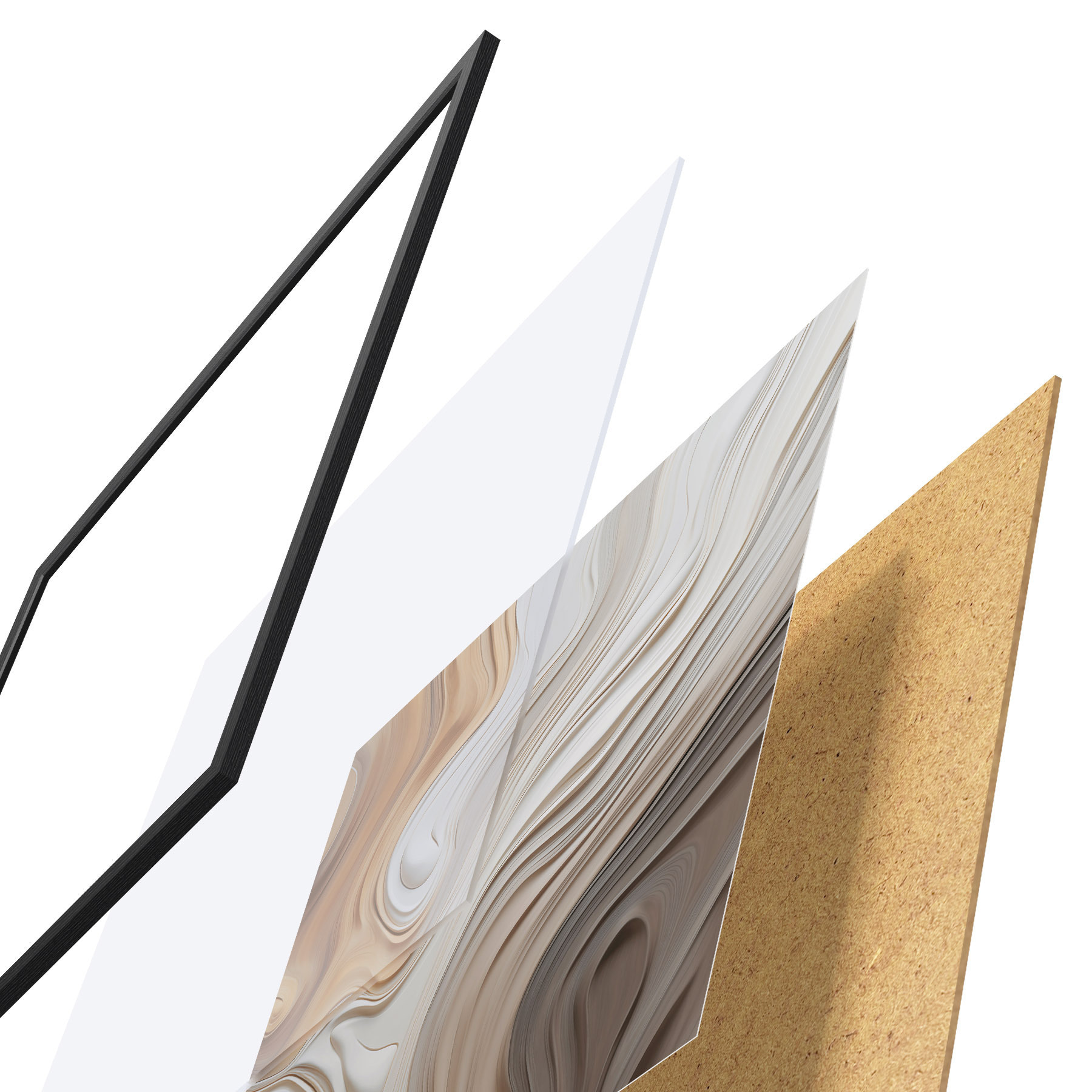Das Poster besteht aus einem Rahmen, Plexiglas, einem gedruckten Bild und einer Rückwand aus Spanplatten. Dank der Halterungen auf der Rückseite kann das Poster sofort an die Wand gehängt werden.