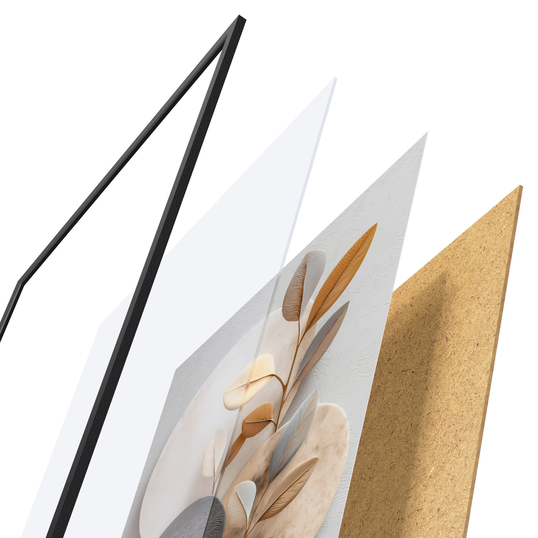Das Poster besteht aus einem Rahmen, Plexiglas, einem gedruckten Bild und einer Rückwand aus Spanplatten. Dank der Halterungen auf der Rückseite kann das Poster sofort an die Wand gehängt werden.