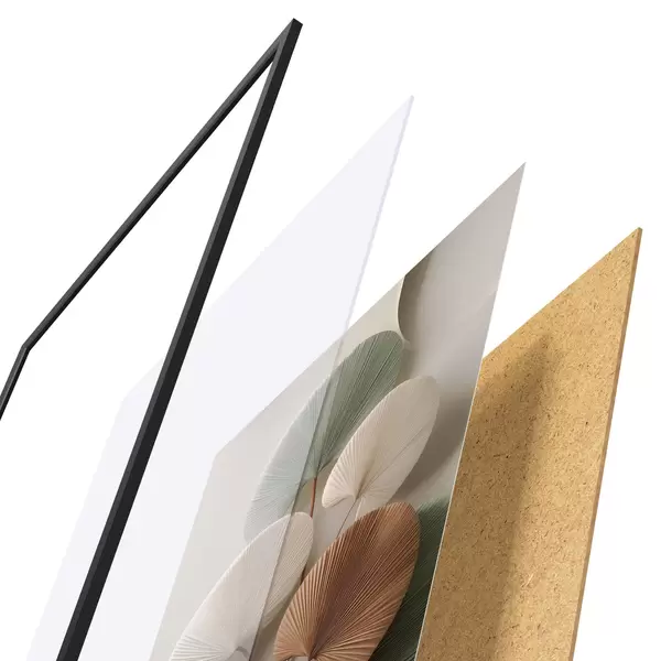 Das Poster besteht aus einem Rahmen, Plexiglas, einem gedruckten Bild und einer Rückwand aus Spanplatten. Dank der Halterungen auf der Rückseite kann das Poster sofort an die Wand gehängt werden.